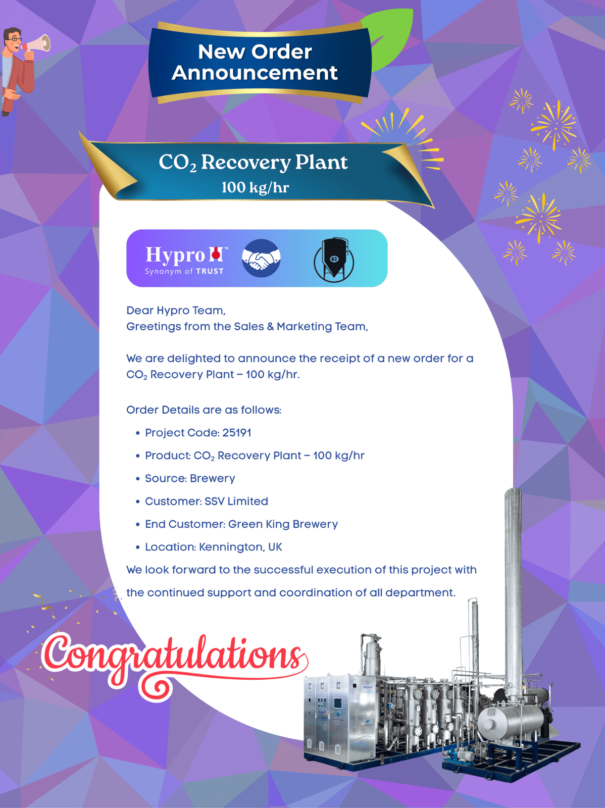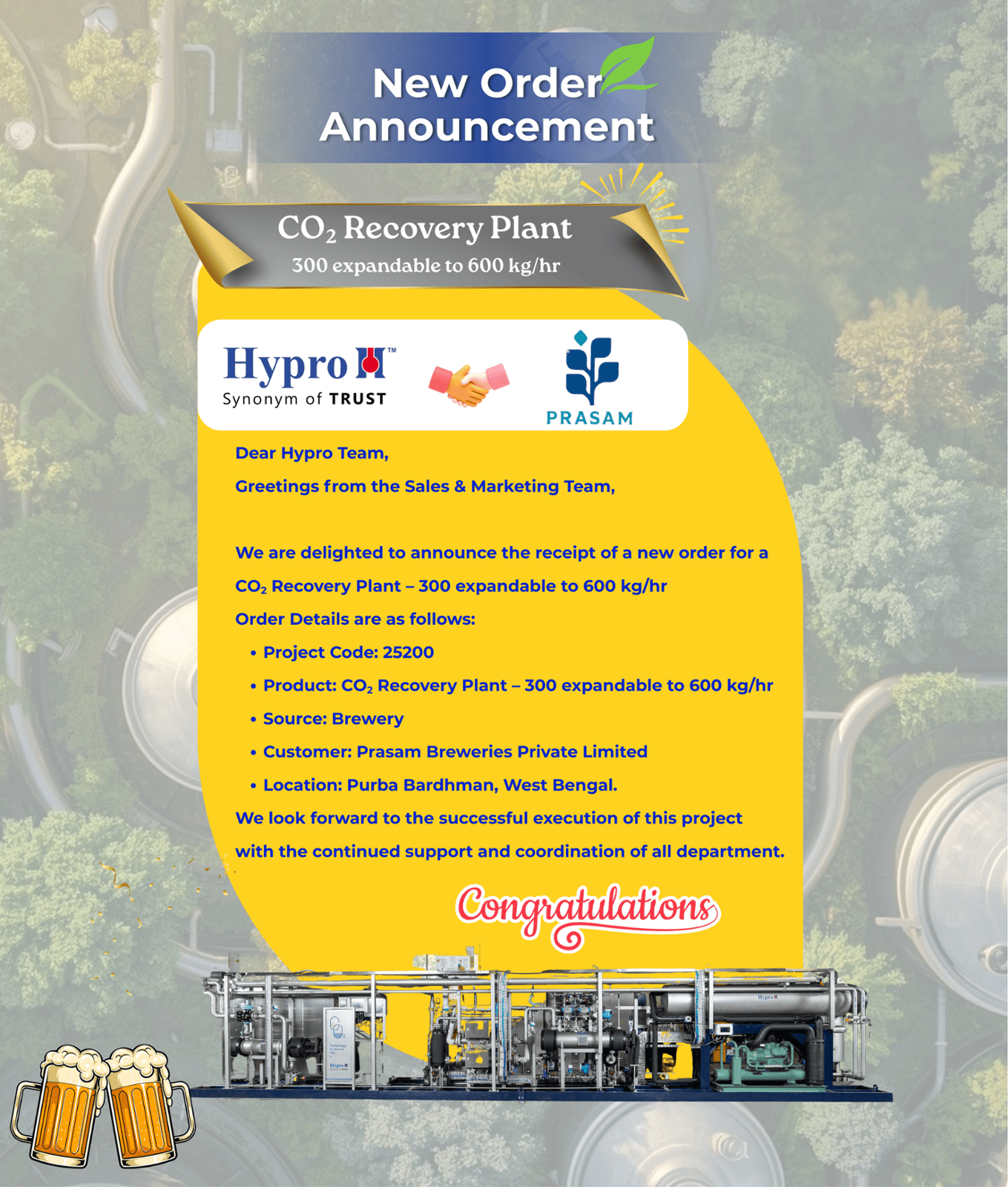 Hypro is a turnkey solution provider for Breweries, CO2 recovery, On site Oxygen rectification, Water De-oxygenation and Energy Saving solutions across the globe. It provides one-stop solutions that are tailored according to need. The company with its innovative approach and technology-driven products has made a stellar reputation for itself on the global stage. Hypro has mastered the art of delivering customized solutions as per international quality standards, with focus on energy efficiency, cost optimization and environmental sustainability.